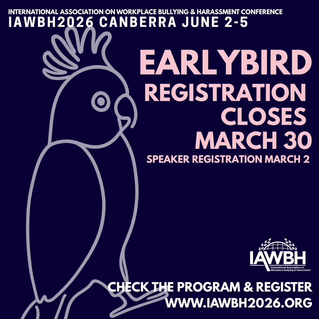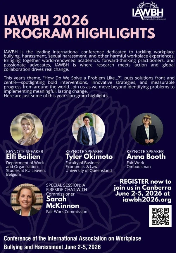 The IAWBH invites you to join us in Australia's Capital, Canberra, at the 15th biennial conference on workplace bullying and harassment. This year the conference theme is "How do we solve a problem like..?" We'll be talking about workplace bullying and harassment, sexual harassment, conflict, mistreatment, incivility and other psychosocial hazards and risks, among other important experiences that can negatively impact people at work.